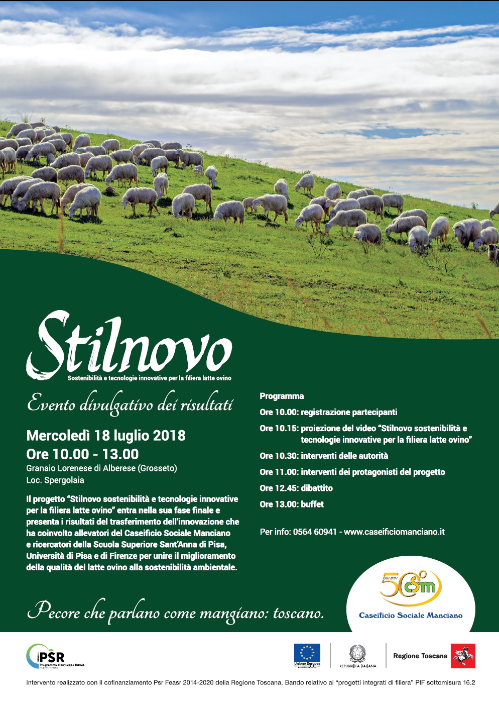 L’appuntamento si aprirà con la proiezione del video “Stilnovo sostenibilità e tecnologie innovative per la filiera latte ovino” che ripercorrerà tutte le fasi del progetto ed entrerà nel vivo con gli interventi dei diversi soggetti coinvolti: dal Caseificio Sociale Manciano, capofila del progetto cofinanziato dal Psr Feasr 2014-2020 della Regione Toscana – Bando relativo ai “progetti integrati di filiera” PIF sottomisura 16.2, ai soci allevatori che hanno messo a disposizione pascoli e parte delle greggi fino ai rappresentanti dei tre atenei toscani. Dopo il dibattito, è previsto un buffet per tutti i presenti con i sapori tipici del territorio e una degustazione dei formaggi del Caseificio Sociale Manciano.